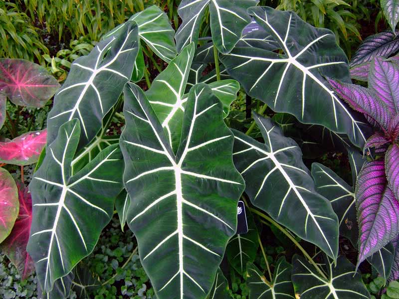 - Алоказія Сандера — має темно-зелене листя з яскравими жилками.