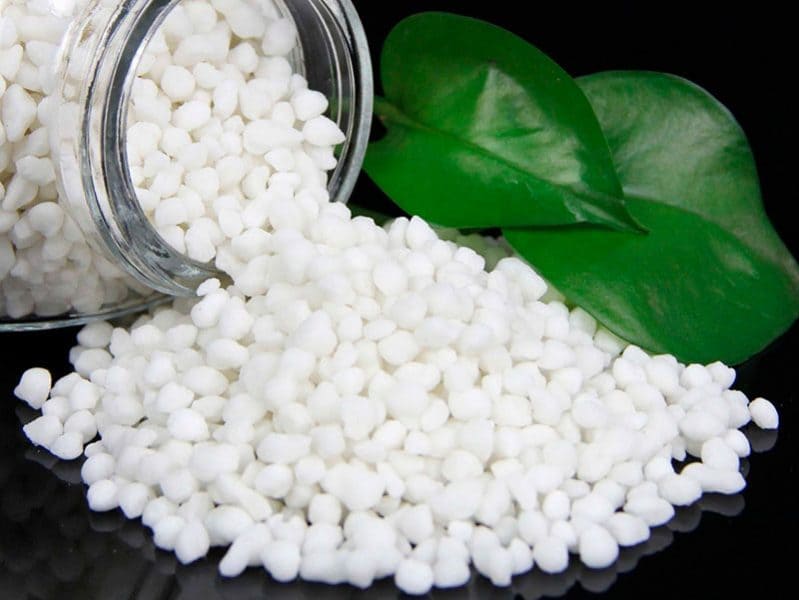 Виглядає вона як дрібні гранули білого або злегка кремового кольору. Їх легко розсипати вручну або через розкидач. Селітра добре розчиняється у воді, але любить вологу, тому зберігати її треба сухо. Якщо потрапить до вологого приміщення – гранули злипнуться.